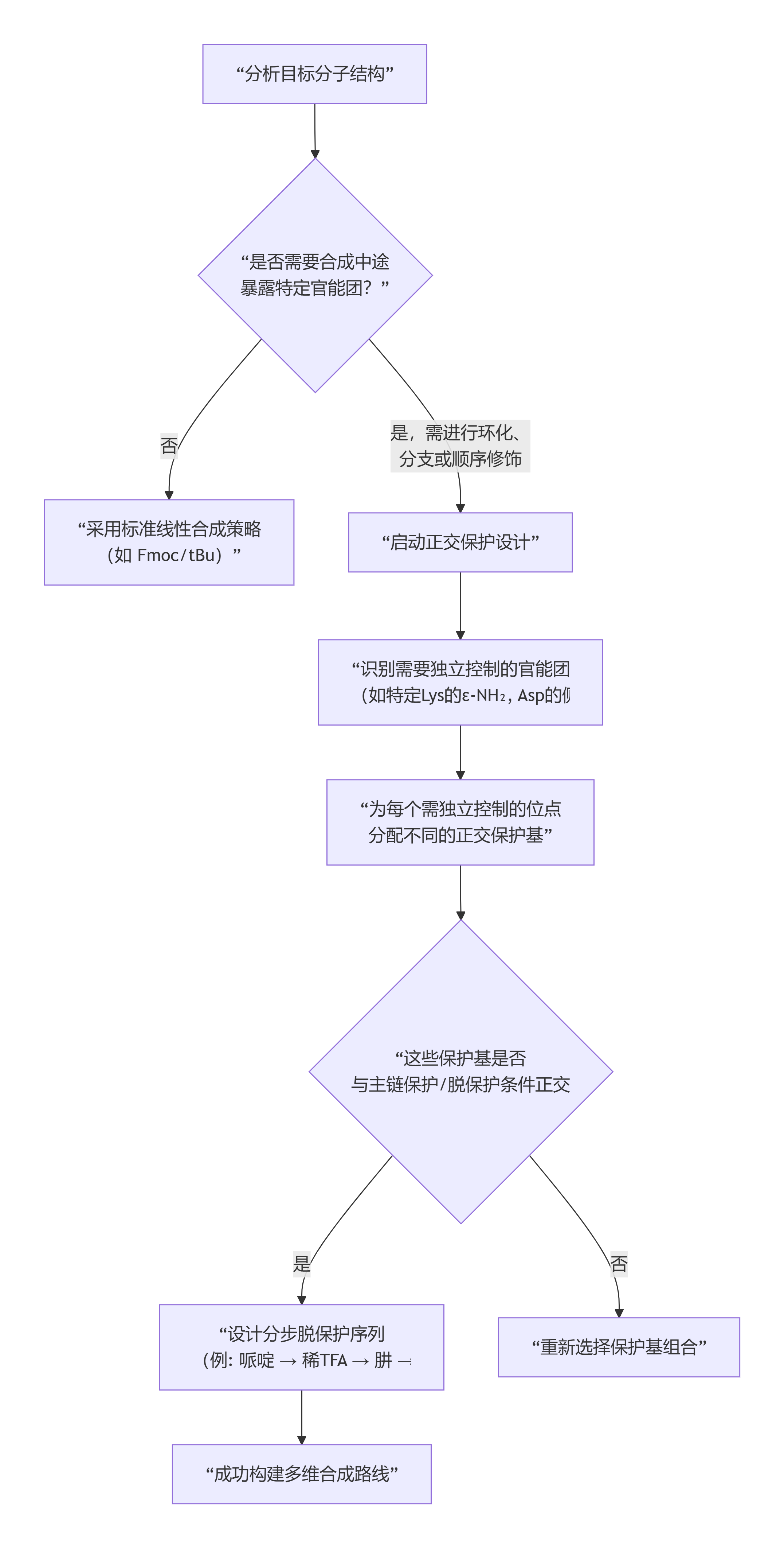 如果说线性多肽合成是“一维”的链式组装,那么合成环肽、枝化肽、多位点特异修饰肽等复杂结构,则需在“多维”化学空间中实现官能团的精准操纵。实现这一跃迁的核心钥匙,即是正交保护策略。本文旨在系统阐明正交性的精确定义,建立其“完全正交”、“部分正交”与“正交性层级”的实用分类框架,并揭示这一概念如何将化学家从序列延长的束缚中解放出来,赋予其如同建筑师般在分子骨架上进行多维度设计与施工的能力。
