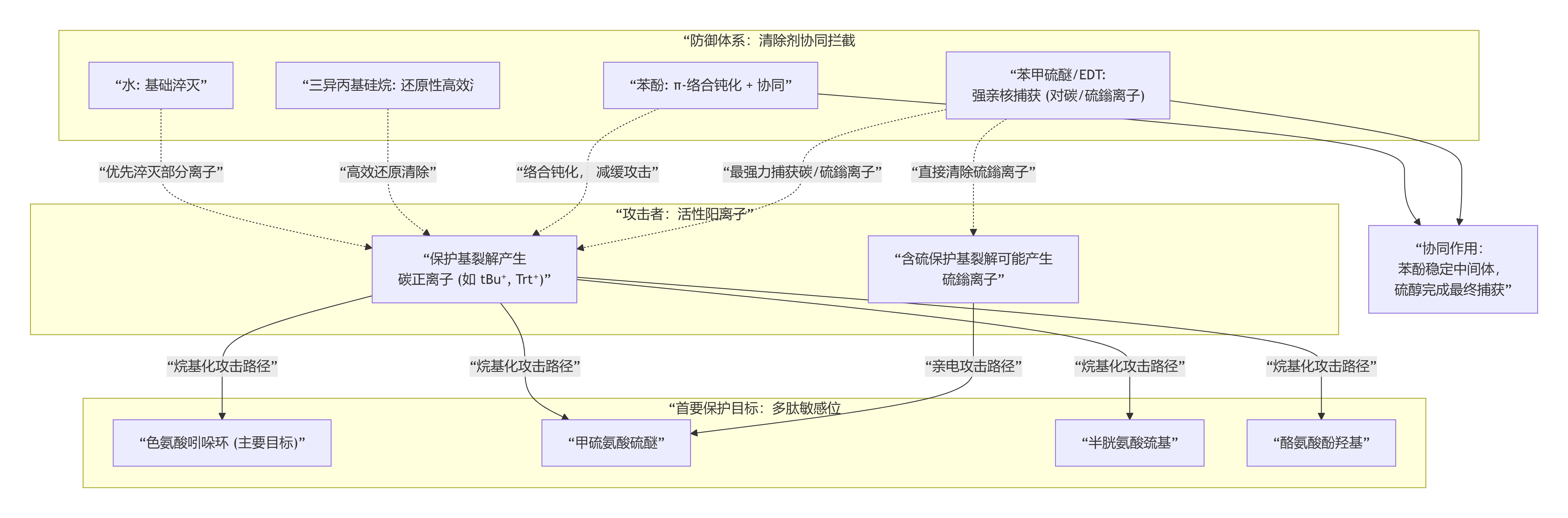 切割鸡尾酒的本质,是围绕TFA构建一个动态的、多层次的亲核清除剂网络,在有害阳离子攻击肽链之前,将其高效淬灭。