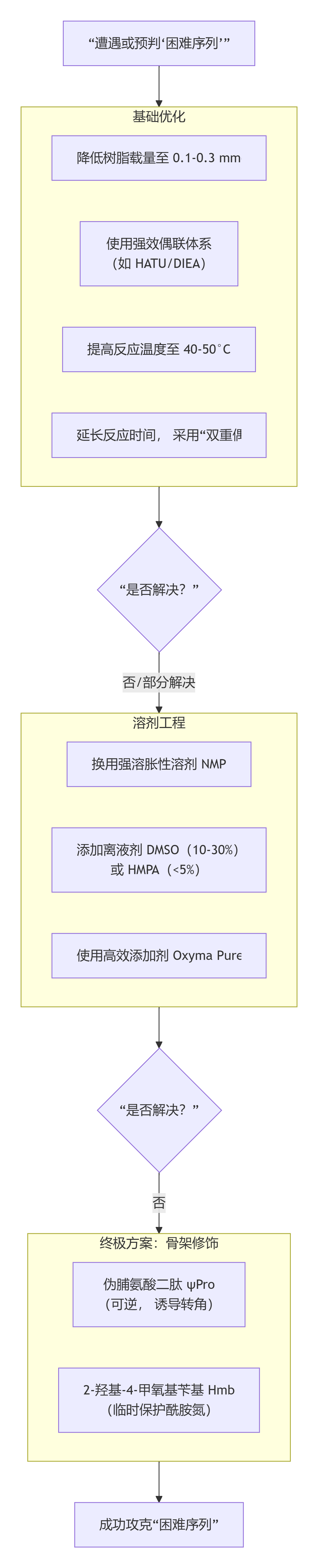 终极准备:若上述方法仍失败,则需重新设计,将序列中的 Ile-Ala 替换为 Fmoc-Ile(ψMe,Mepro)-OH(伪脯氨酸二肽)进行合成。